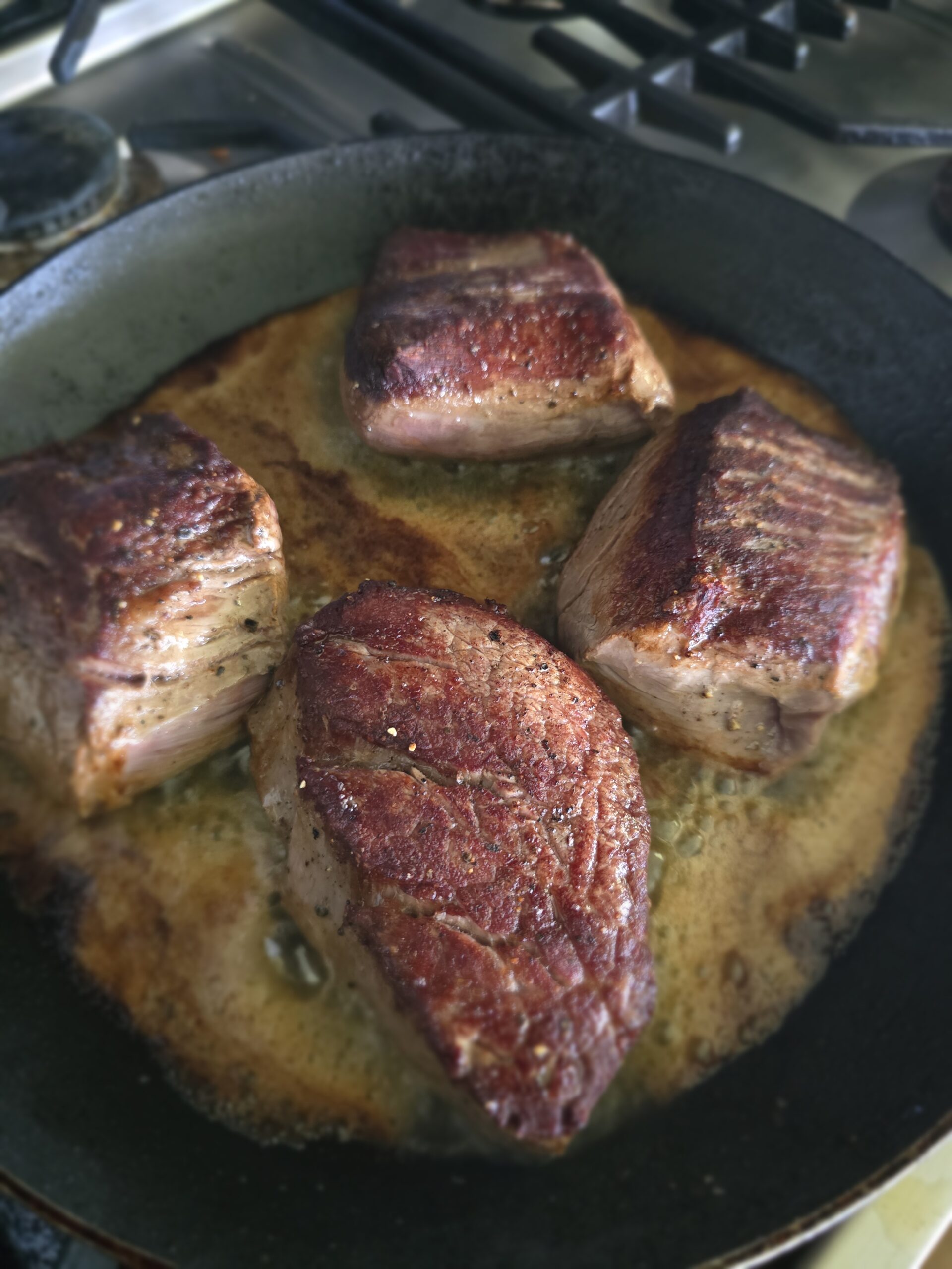 Het op smaak brengen van vleesch dat op hoog vuur kort verhit wordt adviseer ik na bereiding, omdat de smaak van zout iets verloren gaat tijdens verhitting en peper zelfs zou kunnen verbranden waardoor de smaak nadelig beïnvloed wordt. Maar als je ervaring hebt, dan kan vooraf uiteraard wel en trekt de peper juist het vlees in. Braad het vlees in een passende pan, dat wil zeggen, niet te ruim, zodat de (room)boter/olie geen kans krijgt om te verbranden.