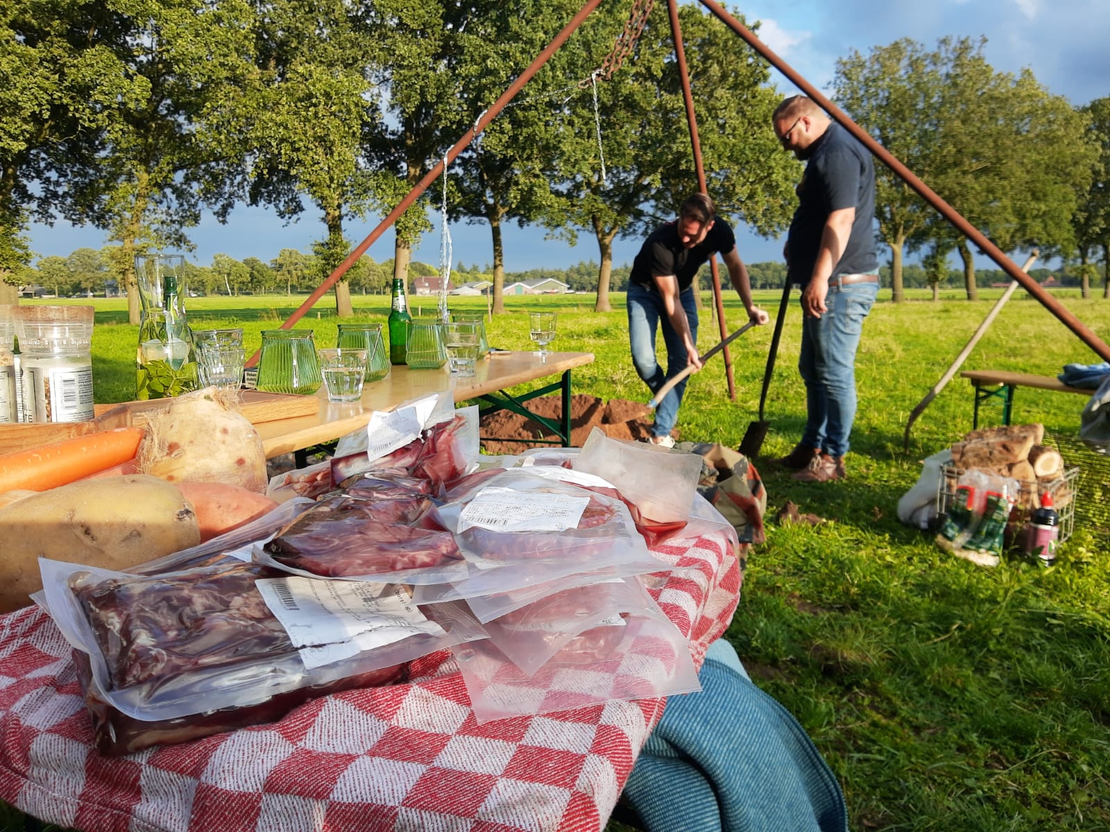 Tegen de avond komen we weer samen in de wei, waar een borrel op ons wacht. Met een lokaal drankje in de hand proosten we op de gezamenlijke inspanning en de mooie dag. Het opgraven van de maaltijd is een spannend moment vol verwachting. Voorzichtig openen we de kuil en halen we de met zorg ingepakte gerechten tevoorschijn. We pakken de warme, geurende pakketten uit en genieten van een uniek diner dat direct uit de kuil komt, met diepe en authentieke smaken. De avond eindigt in een warme sfeer, terwijl we tevreden napraten en fantaseren over de volgende keer dat we deze bijzondere ervaring zullen herhalen.